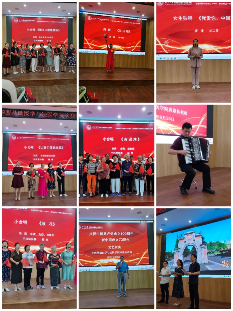 演出在《中华人民共和国国歌》的歌声中拉开了序幕。《唱支山歌给党听》《我和我的祖国》《我爱你,中国》《南泥湾》《映山红》《绒花》《打靶归来》等一首首歌唱出了中华儿女一心向党及对党的无限爱戴之情;《我们走在大路上》《团结就是力量》《让我们荡起双桨》《鸿雁》《夕阳红》等歌曲唱出了beat365官网离退休教师退而不休,积极向上的精神状态;舞蹈《江山颂》以舒展优美大气的舞姿表达对祖国大好河山的热爱之情;手风琴独奏《啊朋友再见》歌曲生动形象地表现出游击队员们对家乡的热爱和大无畏的英雄气概。老师们以昂扬向上的精神面貌,以美妙动人的歌声和舞蹈,唱响了铭党恩、颂党情、跟党走的激扬旋律。观众席上年纪大不便表演的老师也手拿国旗,跟随表演台上老师的音乐一起挥舞。学院青年教师还带来原创诵读作品《川大不会忘记》,表达学院老师对我校革命先烈的缅怀之情。活动还邀请多次获得国内歌唱比赛奖项的四川省歌舞剧院青年女高音刘芳菁老师为大家表演,刘老师高水平的演出,赢得老师们的阵阵掌声。最后,近两个小时的演出活动在全体合唱《没有共产党就没有新中国》中圆满结束。