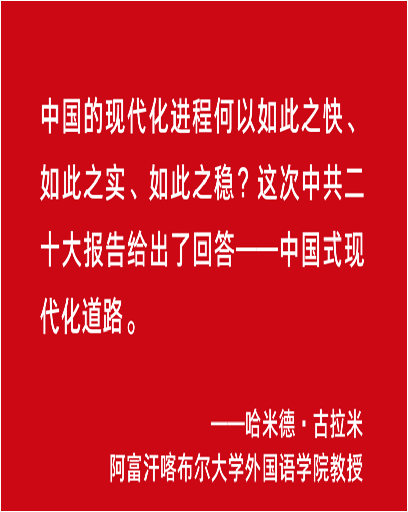 阿富汗喀布尔大学外国语学院教授哈米德·古拉米多次到访中国,对近十年中国经济社会所取得的巨大成就深感敬佩。古拉米一直在思考这样一个问题:中国的现代化进程何以如此之快、如此之实、如此之稳?这次中共二十大报告给出了回答——中国式现代化道路。