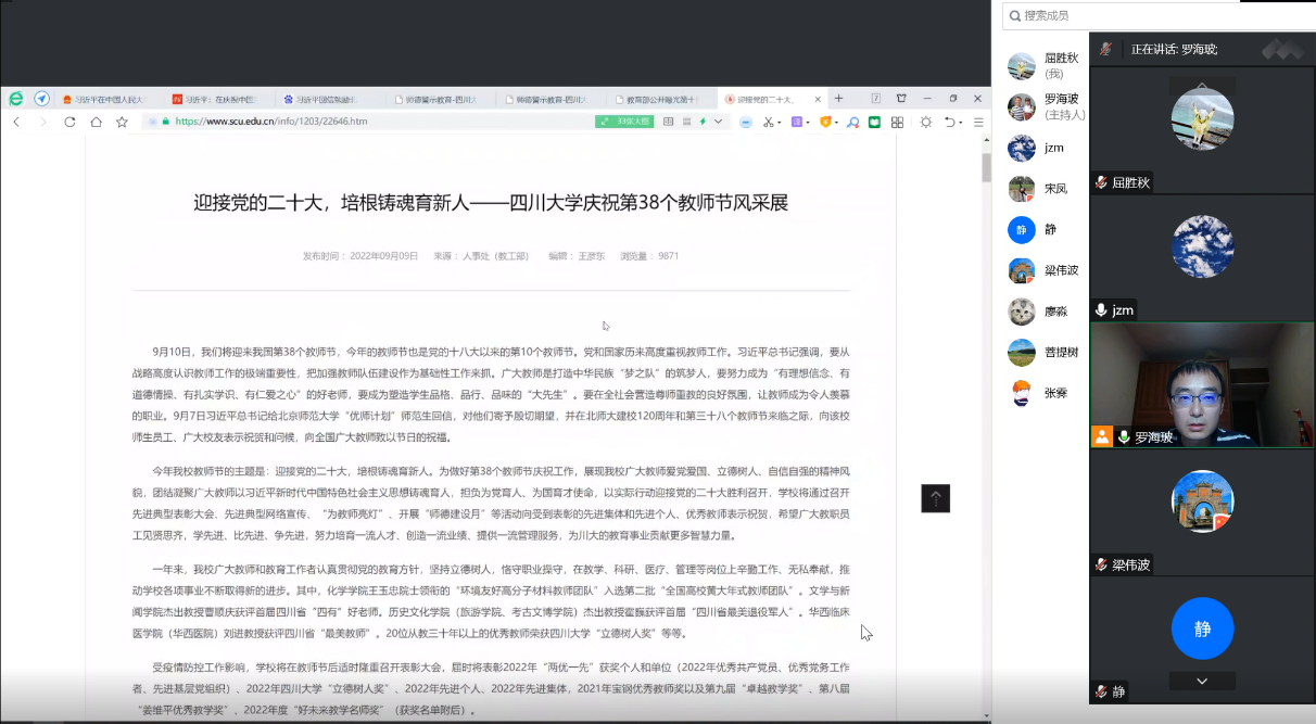 守教育报国初心,担筑梦育人使命。罗海玻主任在线上会议带领大家一起学习了beat365唯一官方网站2022年度先进教师优秀事例即beat365唯一官方网站庆祝第38个教师节风采展,弘扬了优秀教师的榜样力量。