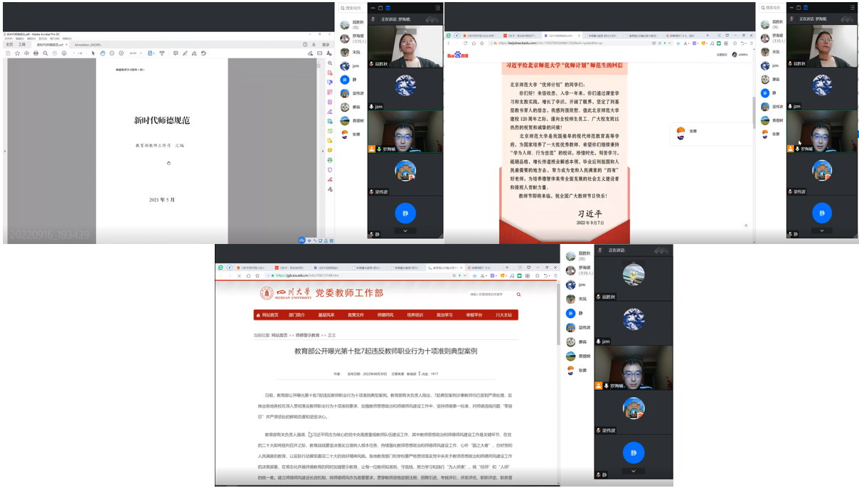 为全面贯彻落实习近平总书记关于教育的重要论述,完善师德建设长效机制,激励广大教师争做“四有”好老师,成为塑造学生的“大先生”,推动学校朝着中国特色世界一流大学的目标坚实迈进。罗海玻主任在线上会议带领全体成员一起学习了《新时代师德规范》以及习近平总书记给北京师范大学“优师计划”师范生的回信精神,还开展了师德失范案例专题警示教育,将教育部公开曝光的第十批违反教师职业行为十项准则典型案例作为典型案例面向全体教研室成员进行警示。