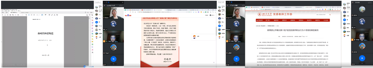 为全面贯彻落实习近平总书记关于教育的重要论述,完善师德建设长效机制,激励广大教师争做“四有”好老师,成为塑造学生的“大先生”,推动学校朝着中国特色世界一流大学的目标坚实迈进。罗海玻主任在线上会议带领全体成员一起学习了《新时代师德规范》以及习近平总书记给北京师范大学“优师计划”师范生的回信精神,还开展了师德失范案例专题警示教育,将教育部公开曝光的第十批违反教师职业行为十项准则典型案例作为典型案例面向全体教研室成员进行警示。