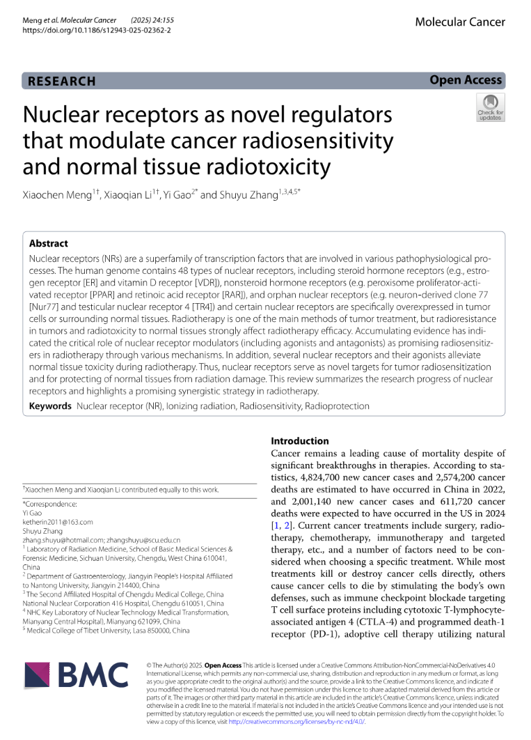 5月30日,beat365官网基础医学强基计划本科生蒙晓晨在《Molecular Cancer》杂志(影响因子27.7;中科院1区)上发表了题为“Nuclear receptors as novel regulators that modulate cancer radiosensitivity and normal tissue radiotoxicity”的论文,指导教师为张舒羽教授。该论文系统性总结了核受体在肿瘤放射增敏和保护正常组织减轻放疗毒性中的研究进展,以期为肿瘤治疗提供新的策略与思路。原文链接:https://doi.org/10.1186/s129...