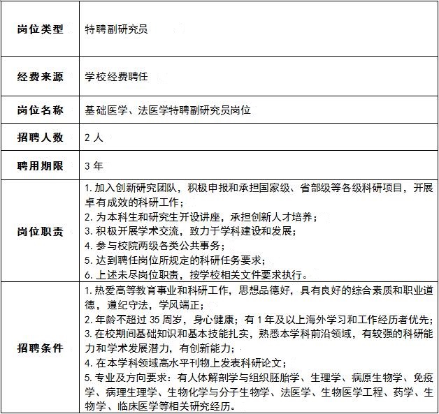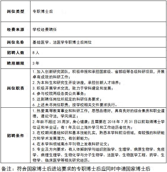 岗位类型专职博士后经费来源学校经费聘任岗位名称基础医学、法医学专职博士后岗位招聘人数3人聘用期限3年岗位职责1.承担教学科研任务,开展卓有成效的科研工作;2.进入既有创新平台,加入研究团队;3.承担创新人才培养;4.承担学科建设任务;5.承担公共事务工作。招聘条件1.遵纪守法,学风端正,身心健康,具有国内外高水平大学博士学位,原则上具有一年及以上海外学习和工作经历;2.年龄不超过35岁;3.具有独立开展科学研究能力,...