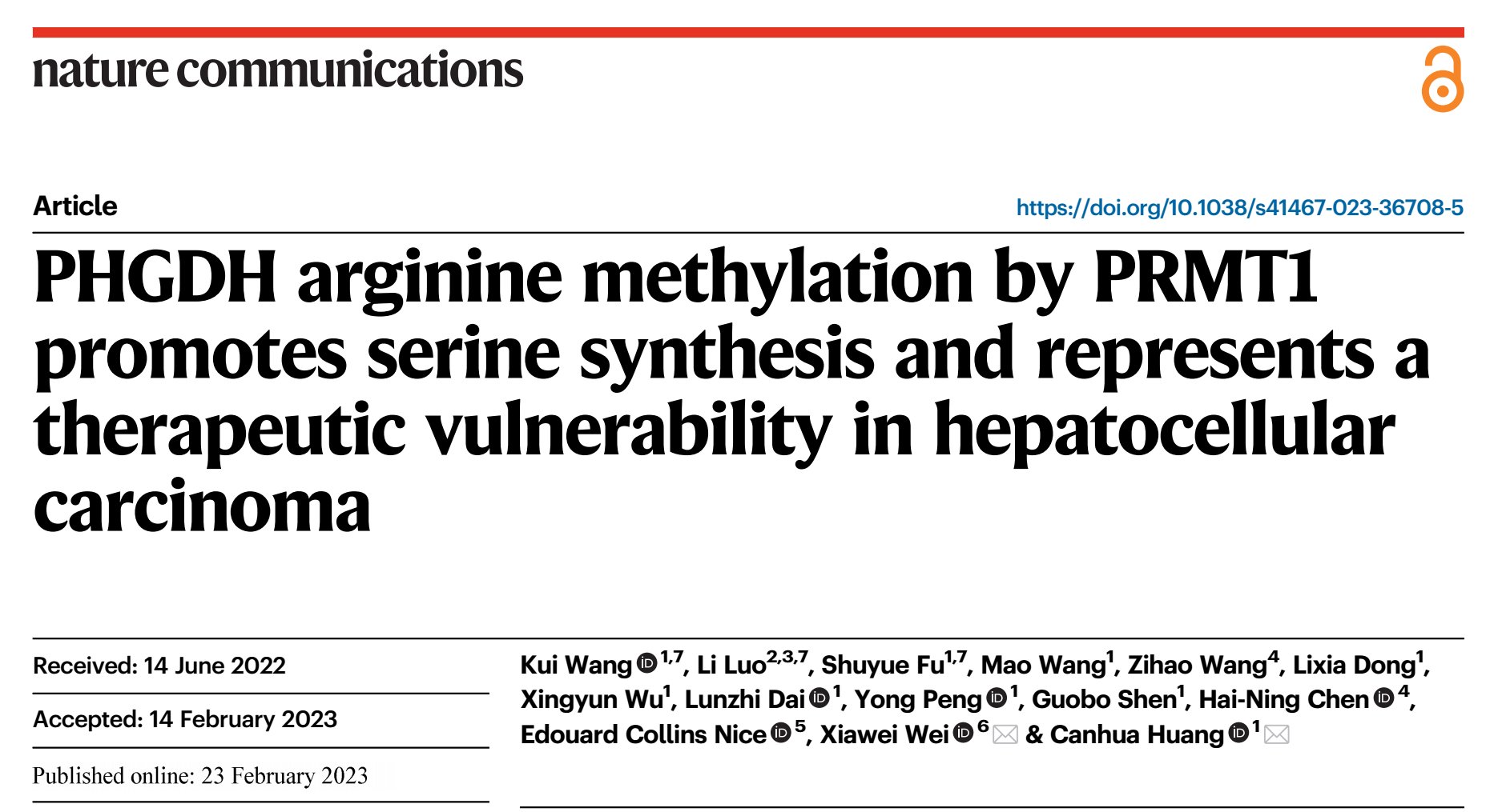 近日,学院王魁副研究员以第一作者在Nature Communications在线发表了题为“PHGDH Arginine Methylation by PRMT1 Promotes Serine Synthesis and Represents a Therapeutic Vulnerability in Hepatocellular Carcinoma”的论文。beat365唯一官方网站华西医院生物治疗国家重点实验室黄灿华教授和华西医院国家老年临床中心魏霞蔚教授为本论文的共同通讯作者。